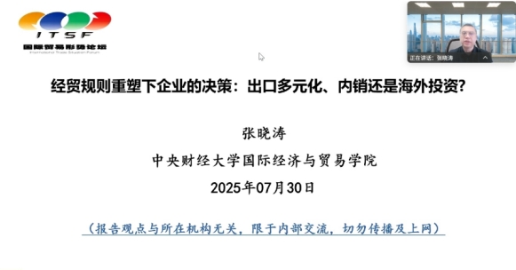 张晓涛(必威betway西汉姆联院长、教授)做了题为《经贸规则重塑下企业的决策:出口多元化、内销还是海外投资?》的专题报告: